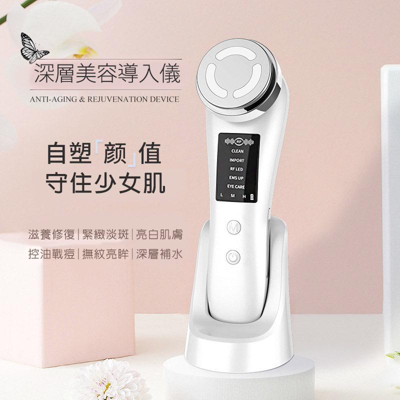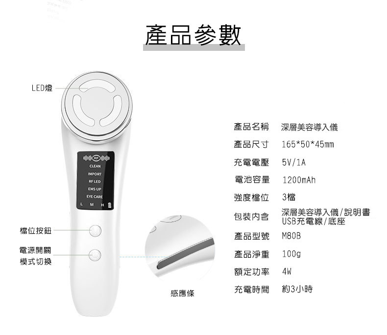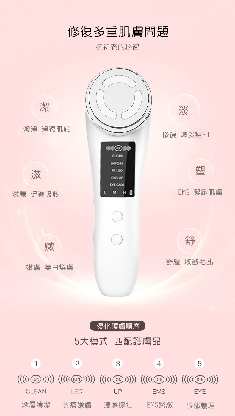 用法:長按電源鍵即開關機,電源鍵同為切換模式鍵(5種模式),M鈕則為檔位鈕(3檔),產品可搭配化妝水、精華液、乳液、面膜一同使用。
