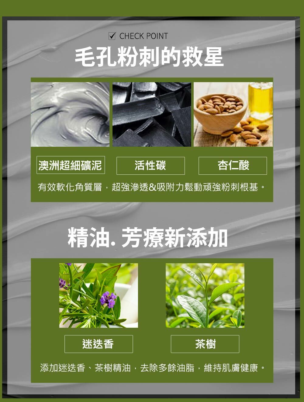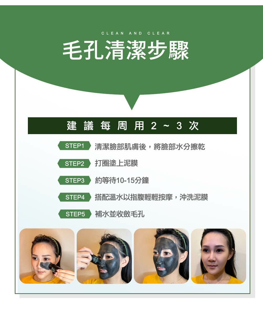 【使用方法】清潔完成,以畫圓方式上臉塗抹15-20秒,等候10-15分
