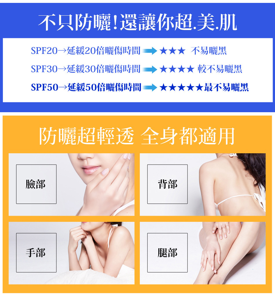 全新水感全護防曬,擁有高係數SPF50★★★★,讓你全身有如穿戴隱形防護膜,