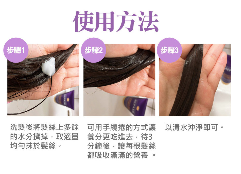 【使用方法】建議每天使用,取適量於掌心,按摩頭髮3分鐘,再以清水沖淨。