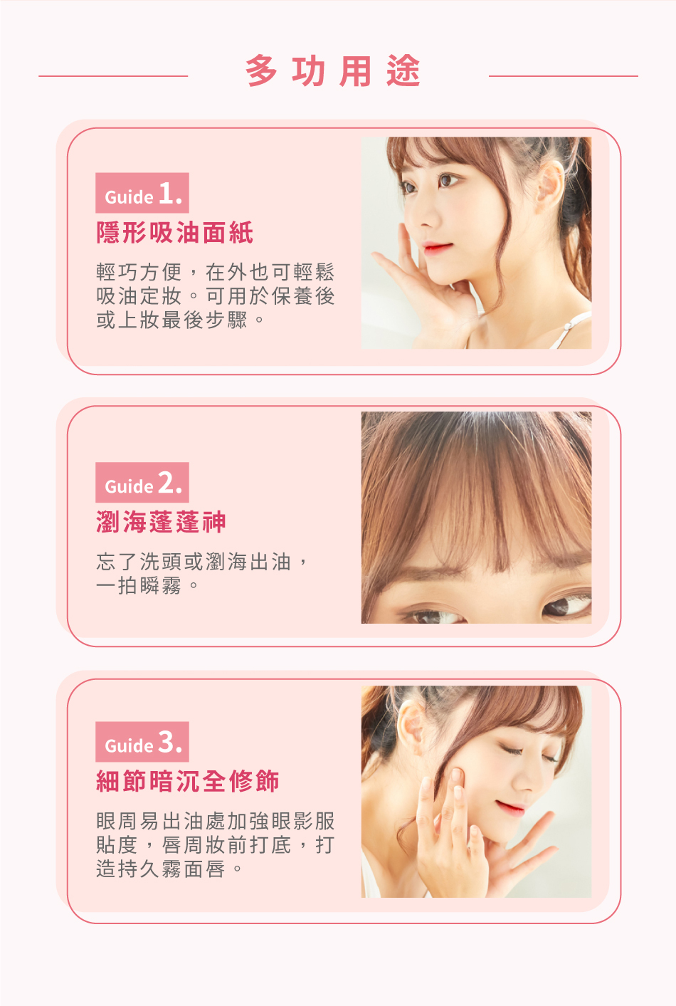 【使用方法】於粉底、BB霜或素顏霜打底步驟後,定妝使用。