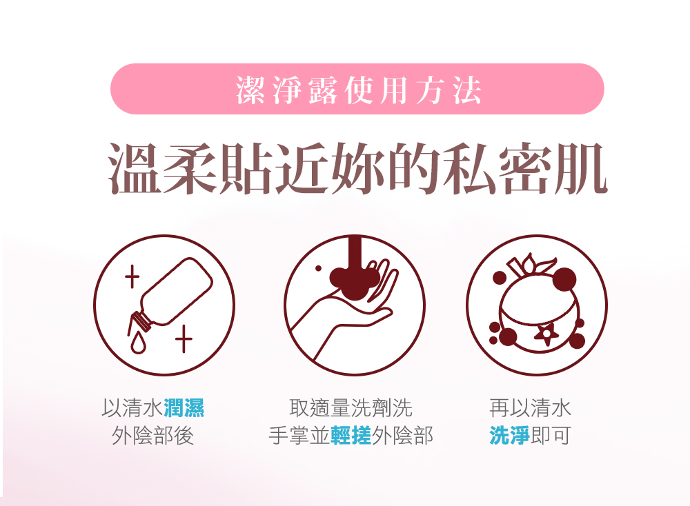 【使用方法】擠出適量於手心搓揉至起泡,輕柔洗淨私密肌膚,再以清水沖淨。