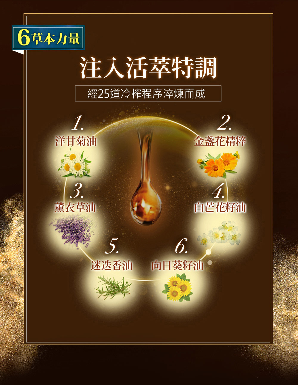 • 6大植萃精華注入,提供肌膚滿滿養分及修護能量