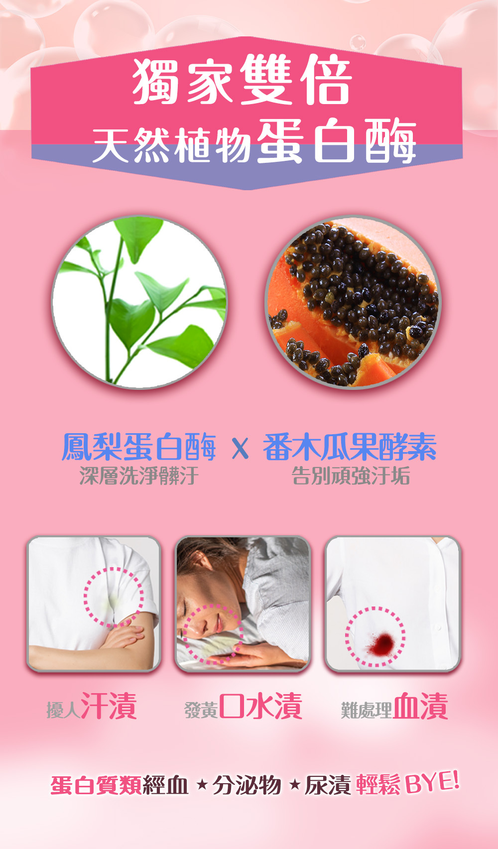 全新雙倍蛋白酶去漬配方,超強天然洗淨力,