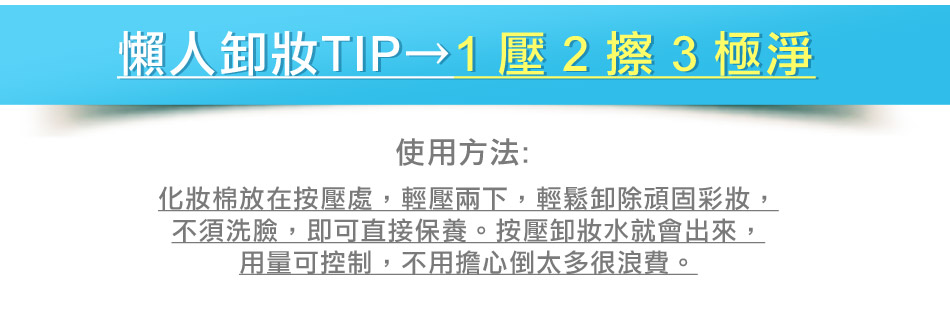 【使用方法】取適量沾取於化妝棉,擦拭至彩妝及髒污卸除,最後以清水洗淨即可。
