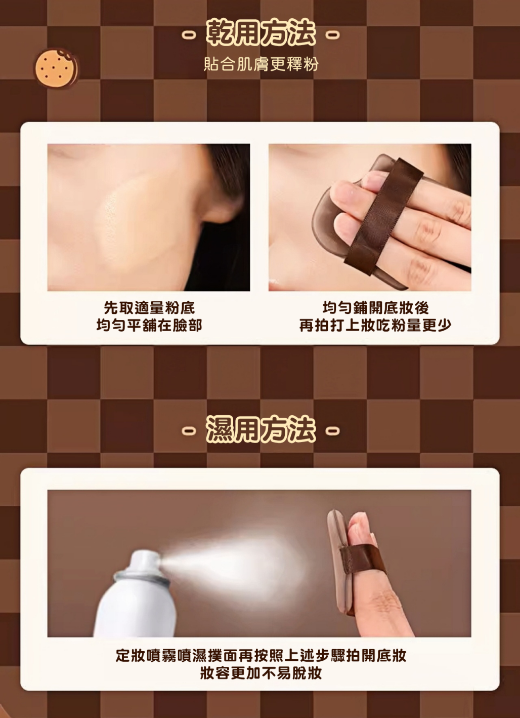 用  法:可乾濕用於底妝產品,輕拍即可快速完成精緻妝容。