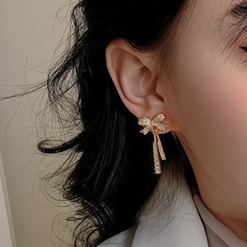 韓系蝴蝶結鑲鑽流蘇耳環