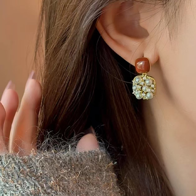 韓系酒紅珍珠幾何鏤空閃鑽耳環